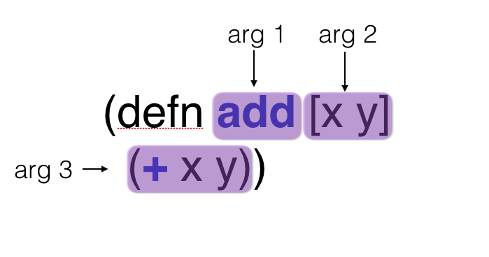 (defn add [x y] (+ xy))with